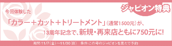 予算 期間中は新規・再来店ともに「パーマ+カット+トリートメント」(通常1600元)が900元、「縮毛矯正+カットー+トリートメント」(通常2100元)が1100元、「カット」(通常400元)が300元
