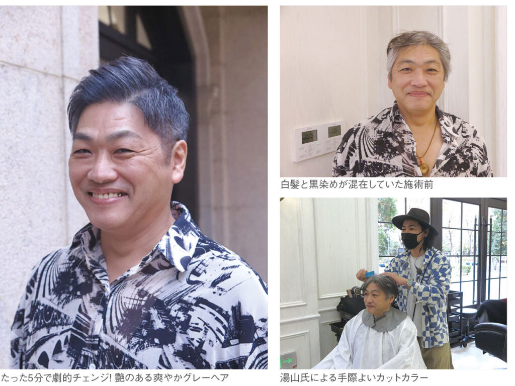 染めの仕上がりは、白でも黒でもない、静かなグレー。黒く染めたときの重さはなく、さらりと軽やかで、まるで髪そのものが光を含んでいるように見えた。 老いを感じていた顔立ちは一変し、若々しさを取り戻す。とてもいい気分だ。この技法だとカラーが白髪とよくなじみ、髪が伸びても白髪は目立ちにくいという。 年末のステージに立つ自分を想像し、年齢を味に変えるこの技法に、思わず深く頷いた。