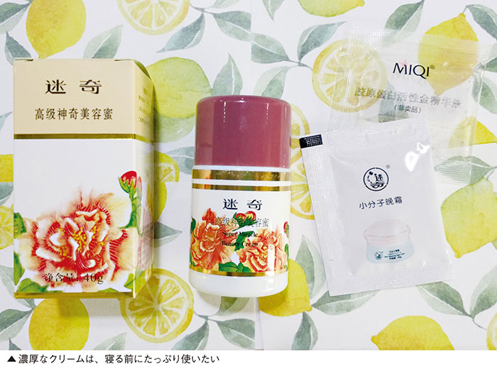 み 私ぐらいの年齢になると、これぐらい濃いクリームを、目元や口元のシワにしっかり塗り込んだ方がいいの! キャンちゃんには、同じブランドの「高級シミ取りクリーム(高級栄養祛斑蜜)」(40元)とか、もう少し軽い付け心地のものが合ってるのかも。今度持ってきてあげるわ。