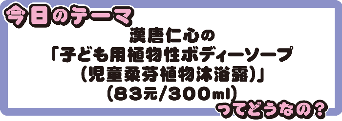 み 察しがいいわね。前回「漢唐仁心」のシャンプーを使ってみてよかったから、最近また同じブランドの「子ども用植物性ボディーソープ」(83元)を買ってみたの。