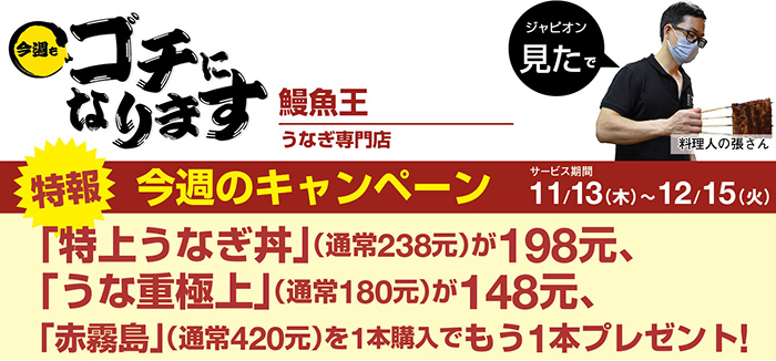 今回は、12月15日(火)までジャピオン見たで来店すると、「特上うなぎ丼」(通常238元)を198元、「うな重極上」(通常180元)を148元としている。また飲み放題2時間、80元も好評だ。土日は14時~16時の団体予約も受け付ける。