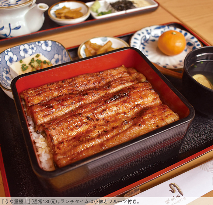 オフィスビル「協泰中心」へ入り、右手にあるエスカレーターを上った2階、飲食店街の一角に店を構える同店。日本人うなぎ料理人に長く師事した経験を持つ張さんと、接客を担当する日本語堪能な鮑さんの夫婦でおいしさを追求している。同店では、日本のうなぎ専門店で使用されているものと同品種の、皮が薄く臭みや脂の少ない、広東省順徳区産のニホンウナギを仕入れている。このうなぎをおいしく焼き上げるためには、団扇で火力を調整する職人技と、強い火力を持った炭が必要だそうで、同店では火力の強い備長炭を使用。自慢のうなぎは、蒸してからタレ焼きを行う、ふっくらとした関東風の「うな重」(98元~)と、パリッと焼いて脂を落とした関西風の「ひつまぶし」(180元)のどちらも用意しているが、まずは張さんの腕が際立つ関東風を食べて欲しい。