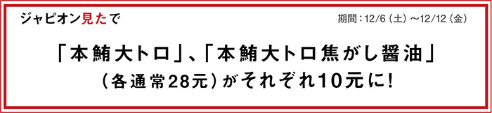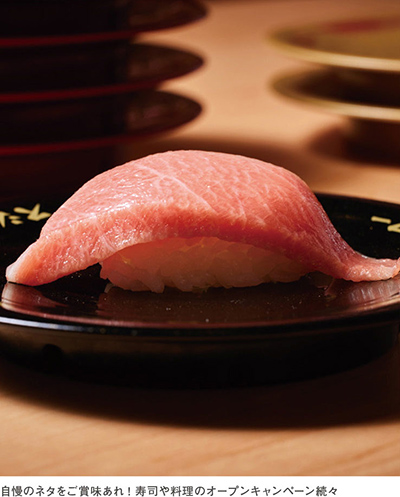 中国各地で行列を作ってきた同店の真髄は、徹底した〝顧客体験〟へのこだわりだ。店内に設置された巨大画面「デジロー」をはじめ、顧客のニーズに応えるエンタメやサービスが盛りだくさん。もちろん味にも妥協なし。鮮度を重視したネタの数々は、ひと口食べればそのおいしさに驚くはずだ。注目の開店記念第1弾は、「本鮪大トロ」と「本鮪大トロ焦がし醤油」(各通常28元)が、10元に。口の中でとろける極上の脂は必食だ。キャンペーンは翌週以降もエビ、カニ、サーモンなどと週替わりで続くほか、100元以上注文で次回から使える10元割引券を1人1枚配付5000枚限定)など、特典も用意。日本の回転寿司の最前線を、その目と舌で確かめてみては?