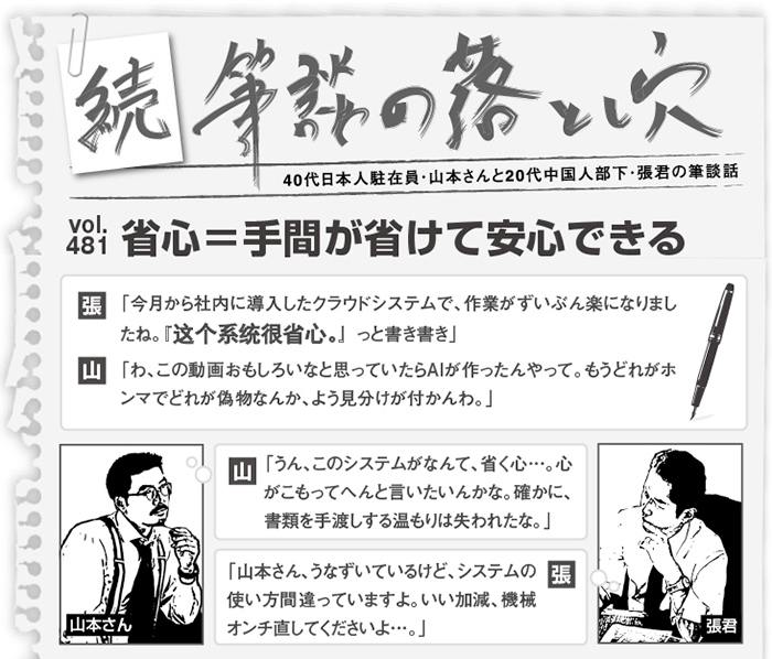 筆談中、張君は新しい社内システムで作業がぐっと楽になったことを山本さんに伝えたかった。ところが山本さんは「省心」を文字どおり「心を省く」と受け取り、システムに心がこもっていないのだと勘違いしてしまったようだ。山本さん! 機械オンチもそろそろ卒業して、もっと心に余裕を持って。
