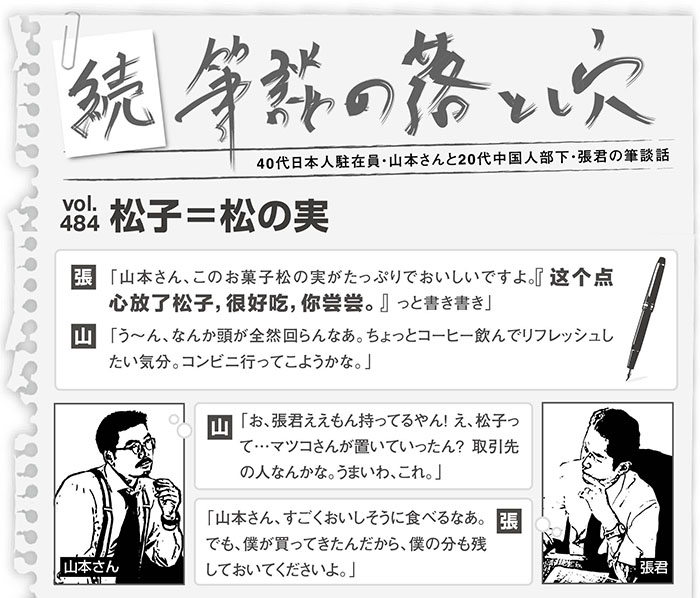 筆談中張君は、この点心は松の実が入っていておいしいと伝えたかった。ところが山本さんは「松子」を人名と勘違いし、取引先の誰かが差し入れをしてくれたのだと思い込んでしまったようだ。山本さん! そのお菓子を持ってきたのはマツコさんじゃなくて張君だ。全部食べると嫌われてしまうぞ。