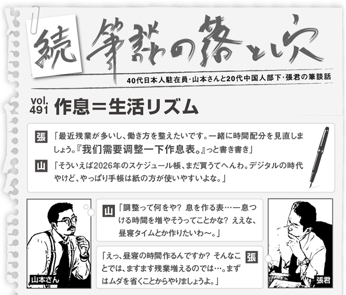 筆談中、張君は「残業を減らすために、働き方の時間配分を見直したい」という意思を伝えたかった。ところが山本さんは「作息」を字面どおり「息を作る=休憩」と受け取り、昼寝タイムの話に…。山本さん! 作息は休息そのものではなく、日々の時間の組み方だ。まずはムダを省くところから始めよう。