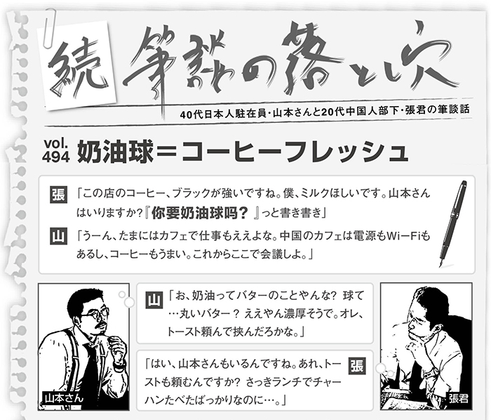 筆談中、張君はコーヒーフレッシュがいるかどうかを尋ねたかった。ところが山本さんは「奶油」をバターと受け取り、何かおいしいデザートと勘違いしてしまったようだ。山本さん! これから出てくるのはコーヒー用の小分けミルクだ。トーストにかけてもおいしくないぞ。