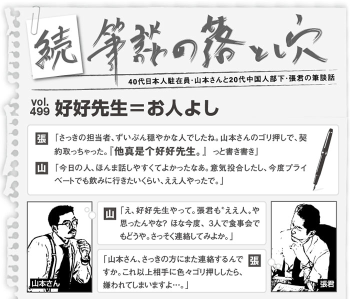 「好好先生(hao3hao3xian1sheng)」は中国語で、人当たりがよく、波風を立てない〝お人よし〟を指す言葉である。文脈によっては「押しに弱い」「八方美人」といった、やや皮肉を含む。