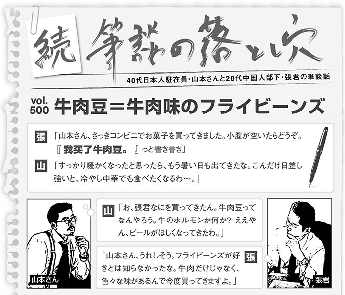 筆談中、張君は「ビーフ味の豆スナックを買ってきた」と伝えたかった。ところが山本さんは字面から、牛肉そのものや肉系のつまみを思い浮かべ、酒の肴の話だと勘違いしてしまったようだ。山本さん! 牛肉豆は豆菓子だぞ。まずはビールより、袋を開けよう。