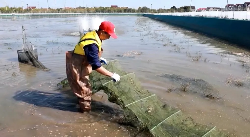 高温が続いた今年の夏には藻類を植え、天然の日よけとして水温を下げる対策がとられた。専用飼料や水質管理の徹底により、安定した生育環境を実現。その結果、今年は昨年を上回る成長を見せ、1ムー(約66平方㍍)あたり約125〜150㌔の収穫が見込まれている。(11月2日)