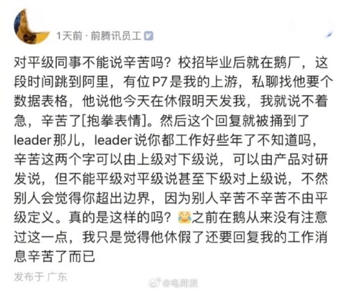 投稿したのは、テンセントを経て現在はアリババで働く女性。内容によると、休暇中の先輩社員に業務連絡をしたところ返信があり、感謝の気持で「辛苦了」と送ったという。しかし、その後リーダーから、「〝辛苦了〟は上司から部下にかける言葉であり、部下から上司に使うものではない」と指摘された。
