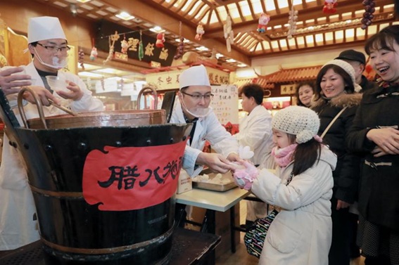 黄浦区「豫園」では同日の朝早くから、「童涵春堂」の粥を求める人々で行列ができ、市民らは20年続く伝統の味に舌鼓を打った。また浦東新区の「上海財神廟」や「伽藍寺」、青浦区の「青龍古寺」や「青浦観音寺」、「天光禅寺」でも早朝から「臘八粥」の無料配布イベントを実施。そのほか、宝山区の「宝山寺」や「宝山蕭泾古寺」、松江区の「福田浄寺」など、今年も市内各地で粥が振舞われた。(1月25日)