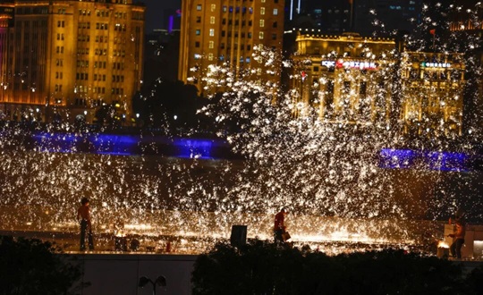 「打鉄花」とは、約1600度に溶かした鉄を柳の枝や木の板で勢いよく叩き、花火のような火花をあげるパフォーマンスのこと。会場は「浦東美術館」西側の濱江エリアで、毎晩19時から披露される。