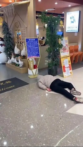 河南省のある商業施設内のレストラン店頭で最近、寝転んで抗議活動を続ける女性が出現した。これに対し店舗側が「状況説明の看板」を設置したところ、逆にシュールなフォトスポットとして注目されている。