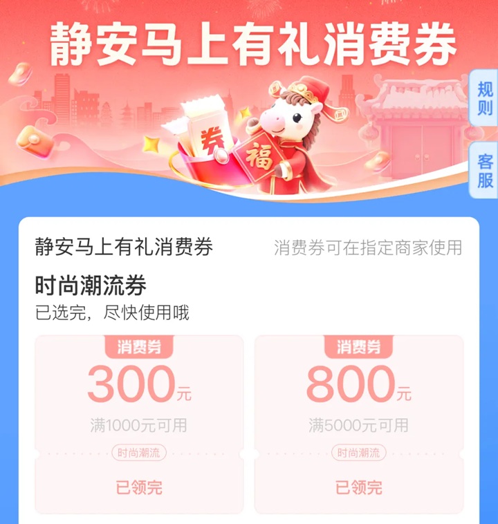 浦東新区では3月5日(木)までの期間中、飲食や買い物に利用できる「浦東迎新消費券」を発行中。最終発行は2月27日(金)12時からで、「支付宝(アリペイ)」で「浦東迎新」と検索すると受領ページへ移動できる。また静安区は3月11日(水)まで、ファッションや美容コスメなどに利用できるクーポンを発行するほか、楊浦区では家電やデジタル機器にも利用できるクーポンを19日(木)まで発行する。松江区では宿泊・観光・交通に利用できるクーポンを5日(木)まで配布することで、観光消費を促進する。